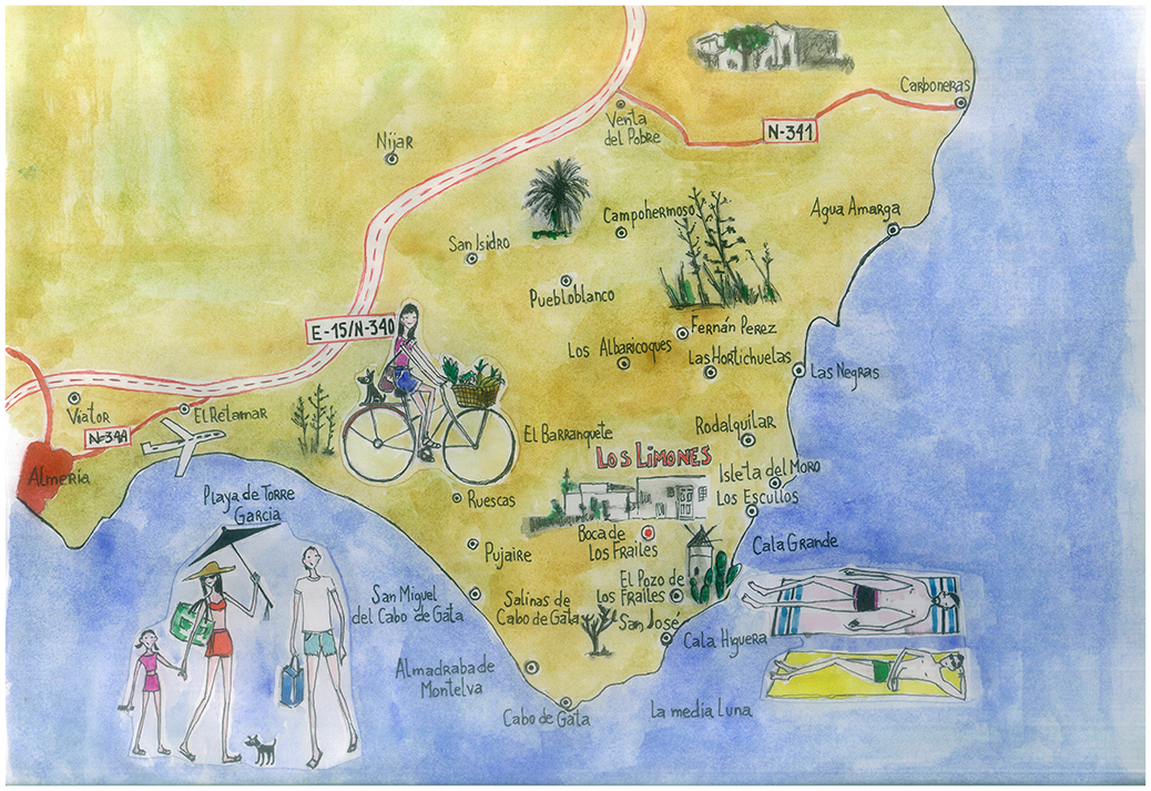 Los Limones se encuentran en un pueblo llamado La Boca de los Frailes, a 10 minutos en coche de San José y de las maravillosas playas de: Genoveses, el Barronal (nudista) y Monsul. A unos 30 minutos del aeropuerto de Almería. Viniendo por la autovia del Mediterraneo, la salida es: Níjar / San Isidro. Siempre en dirección San José, en 20 minutos llegais a Los Limones. Buen viaje!